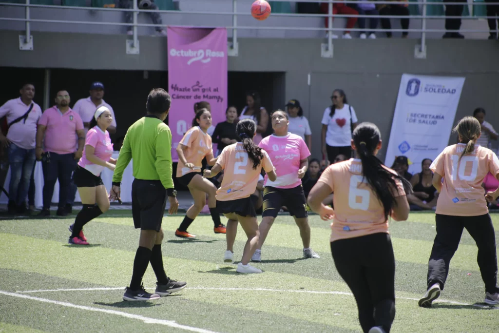Soledad, octubre 19 de 2025. En el marco del mes de la conmemoración de la lucha contra el Cáncer de mama, la Alcaldía de Soledad en articulación con la Secretaría de Salud, la Oficina de Salud Pública y el Plan de Intervenciones Colectivas del Hospital Materno Infantil, desarrollará el campeonato de fútbol femenino “Sácale tarjeta Rosada al Cáncer de Mama, del 20 al 23 de octubre del año en curso, en la cancha del barrio Villa Katanga.